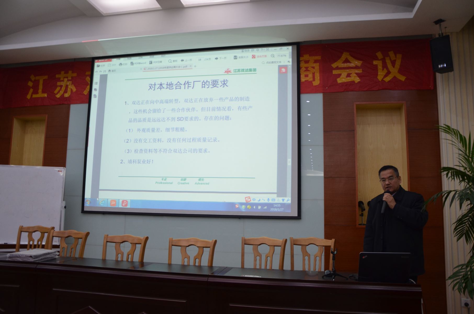 双达公司供应链管理部部长浦海燕代表双达公司做了2017年物资采购情况和2018年物资采购工作规划报告,质量工程师佘军做了2017年度物料质量情况分析报告,研发中心产品经理李银强就2017年度双达公司与供应商技术衔接问题进行了总结并提出了改善建议,财务总监陈涛向供应商朋友们介绍了双达公司货款支付及财务管理改善等情况进行了介绍,常务副总经理张翼飞代表吴永贵董事长向各位供应商朋友在过去一年里给予双达公司的大力支持表示感谢,对供应商的产品质量、交货及时性、交工资料质量细节等改进提出了新的要求,并介绍了双达公司未来五年的发展规划情况。