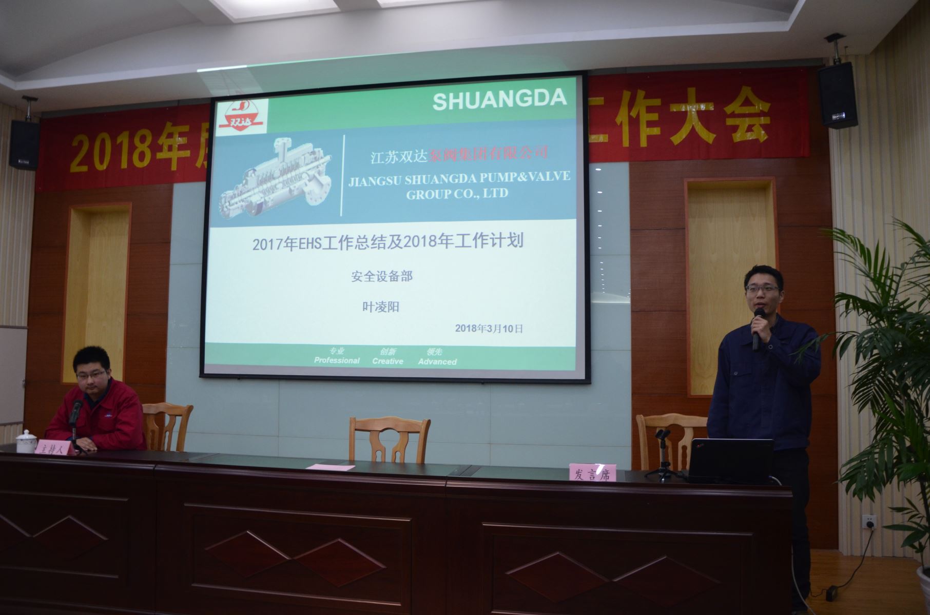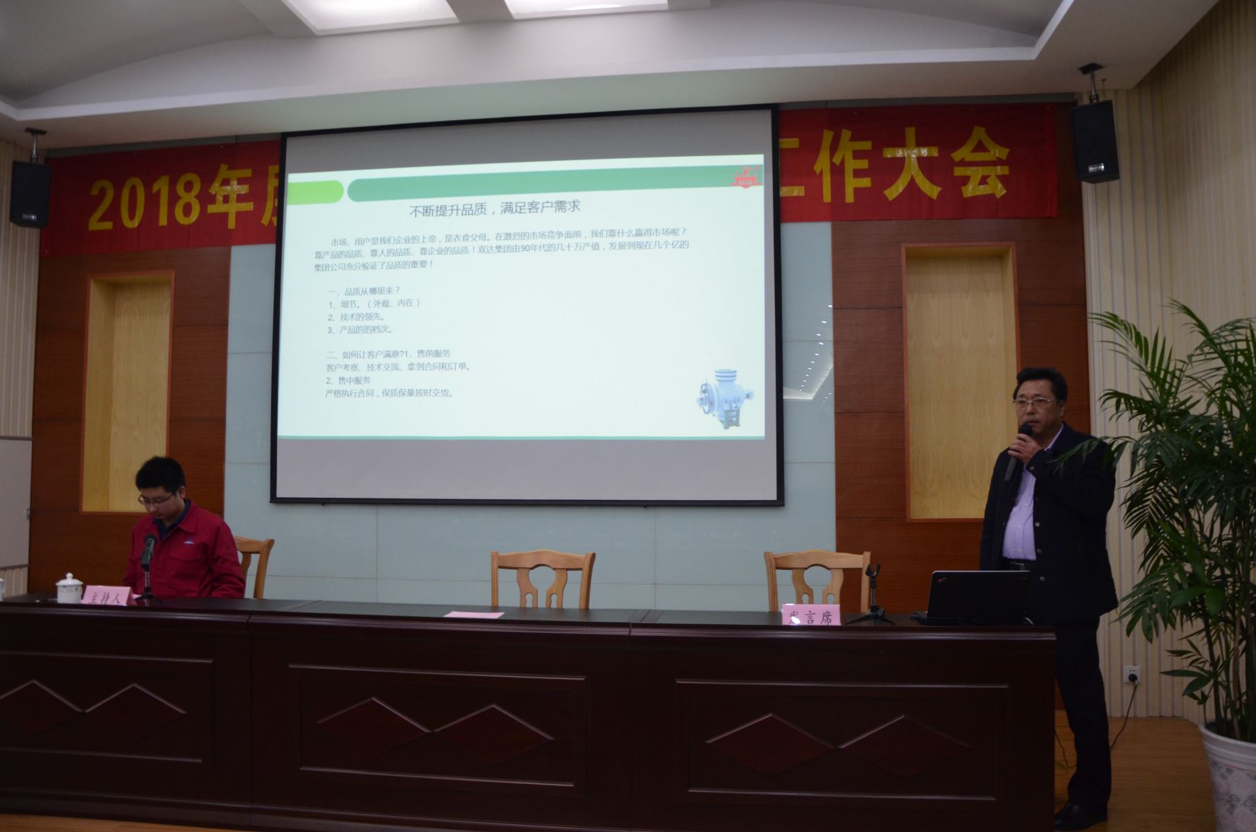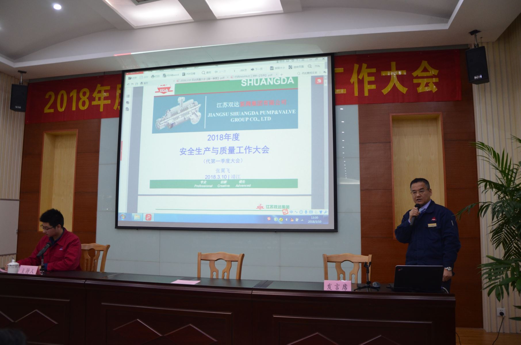 2018年3月10日下午,双达公司召开2018年度安全生产与质量工作大会,全体主管级以上领导及各部门代表共80多人参加了会议。