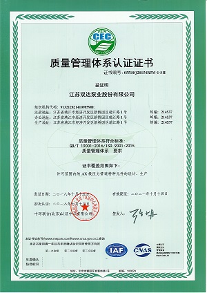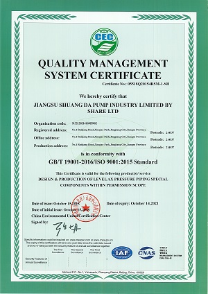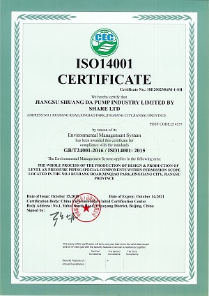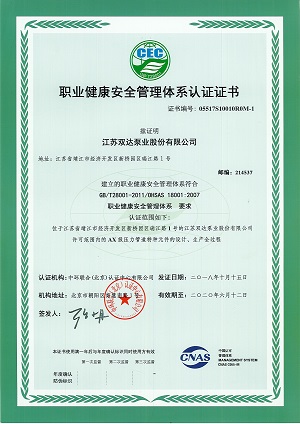 经过专家组严格审核,江苏双达泵业股份有限公司收到中环联合认证中心签发的质量、环境、职