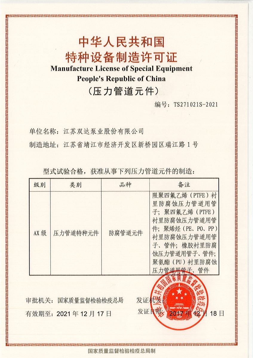 经过约6个月协同努力,近日江苏双达泵业股份有限公司获得中华人民共和国特种设备制造许可证【压力管道元件制造项目 AX级】。