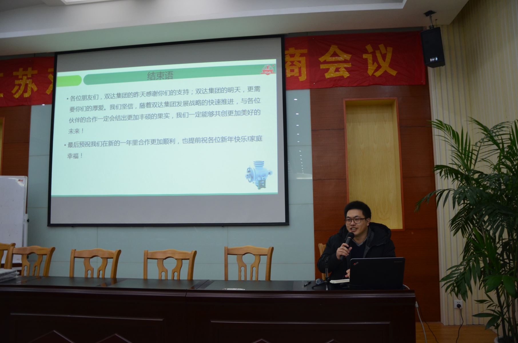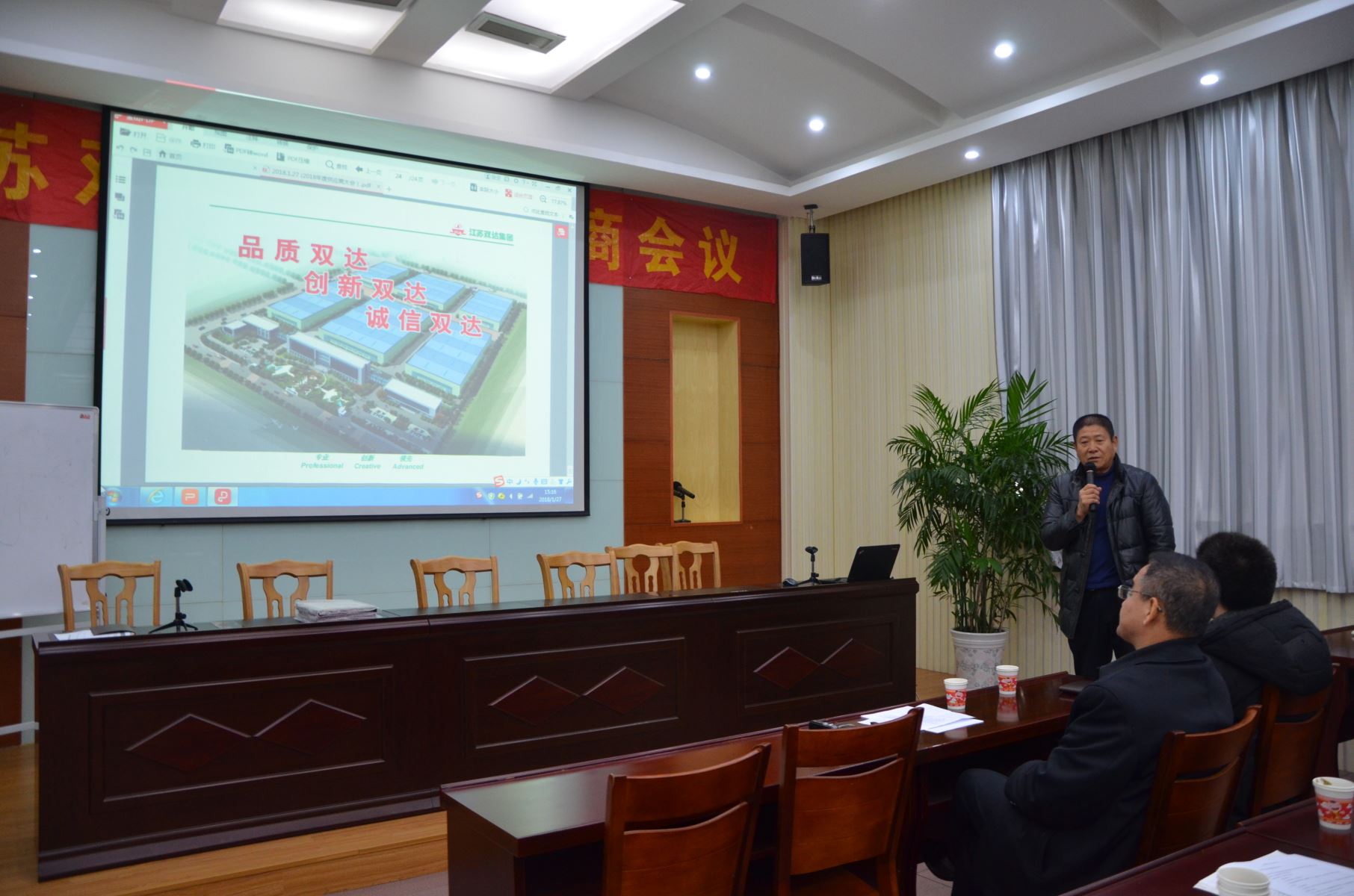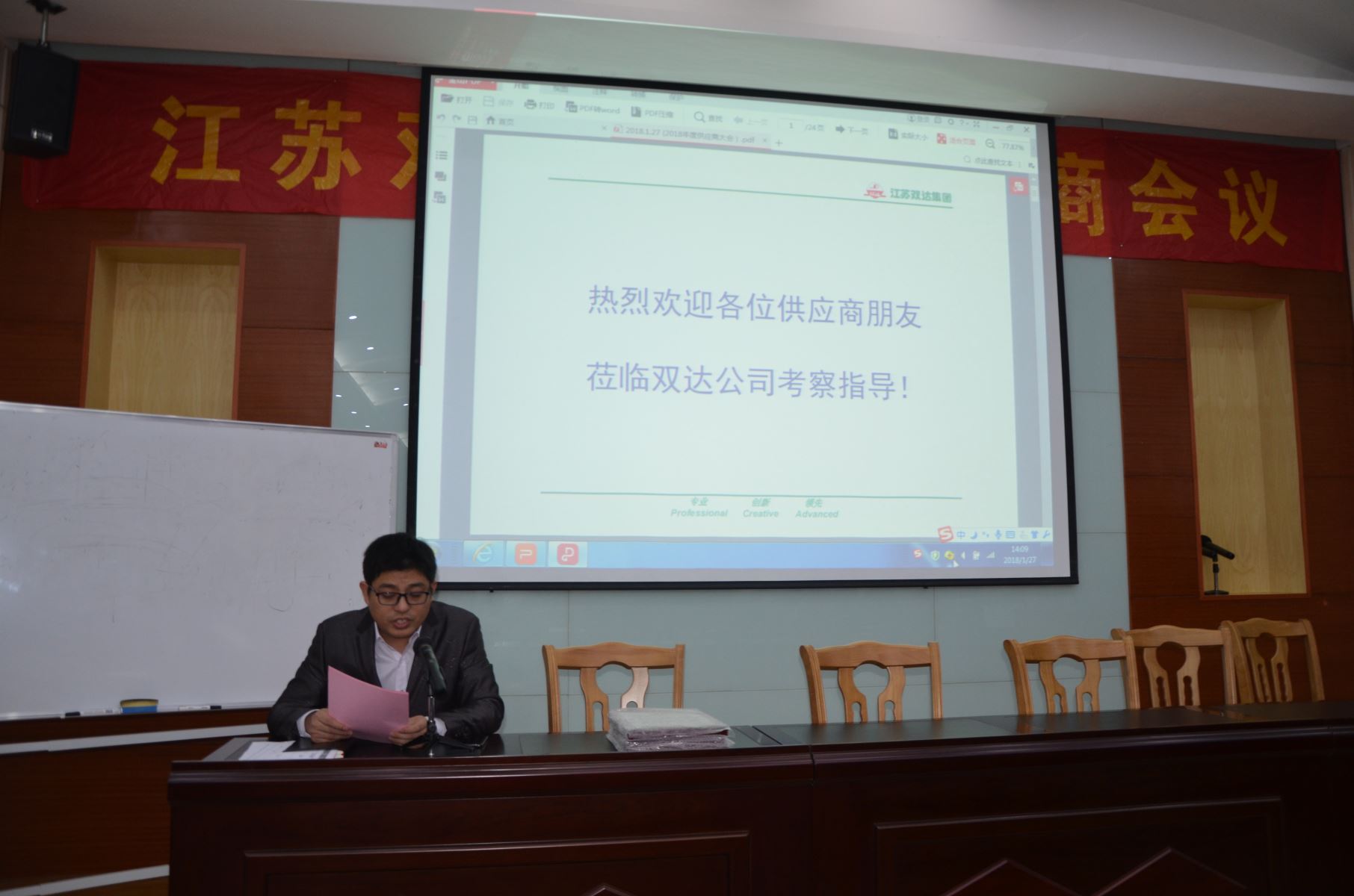 双达公司供应链管理部部长浦海燕代表双达公司做了2017年物资采购情况和2018年物资采购工作规划报告,质量工程师佘军做了2017年度物料质量情况分析报告,研发中心产品经理李银强就2017年度双达公司与供应商技术衔接问题进行了总结并提出了改善建议,财务总监陈涛向供应商朋友们介绍了双达公司货款支付及财务管理改善等情况进行了介绍,常务副总经理张翼飞代表吴永贵董事长向各位供应商朋友在过去一年里给予双达公司的大力支持表示感谢,对供应商的产品质量、交货及时性、交工资料质量细节等改进提出了新的要求,并介绍了双达公司未来五年的发展规划情况。