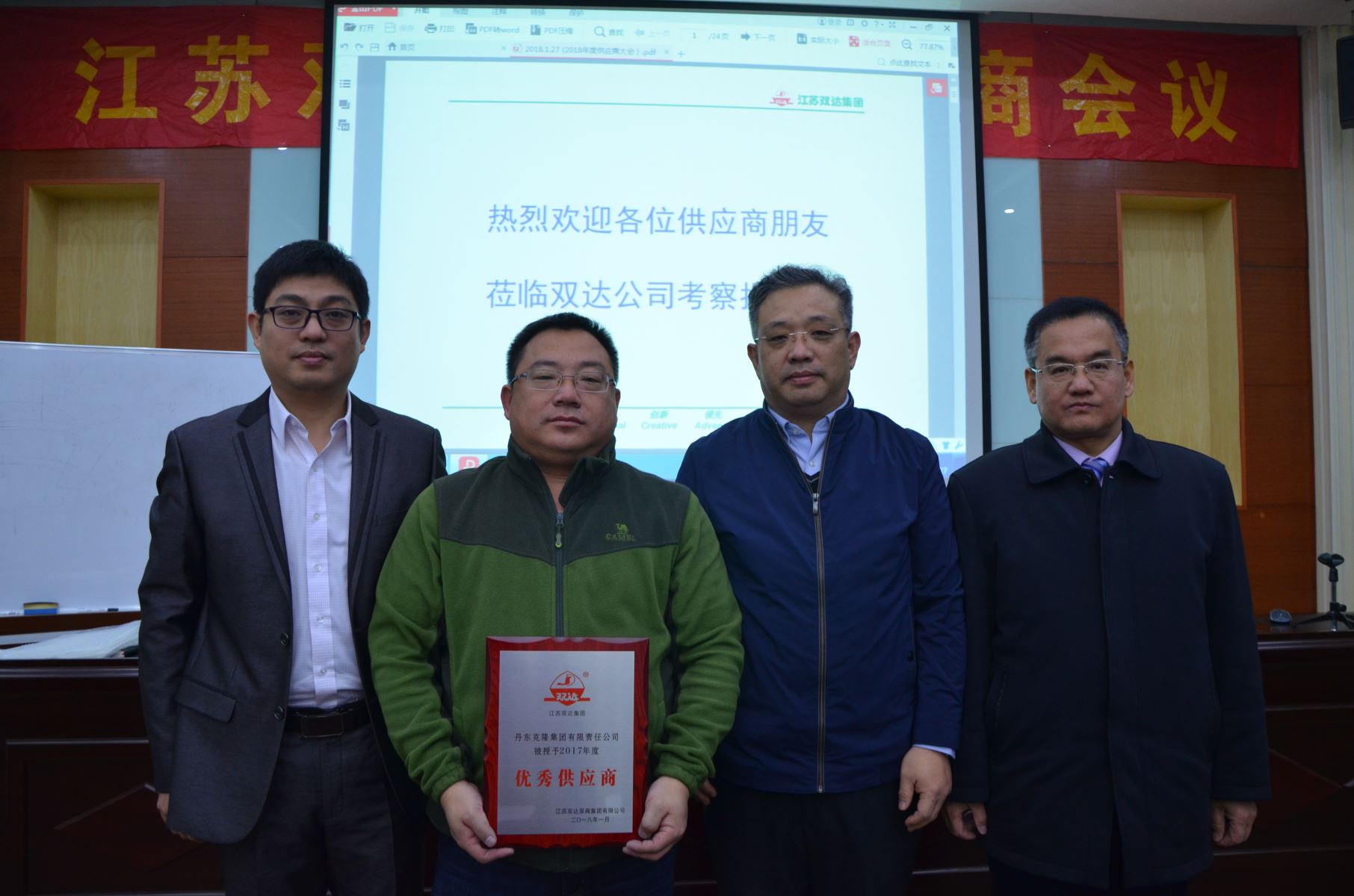 2018年1月27日下午,在双达公司三楼会议厅召开了以“合作共赢,共谋发展”为主题的2018年度供应商工作大会,来自全国各地的40多家供应商代表共 60 余人参加了大会。